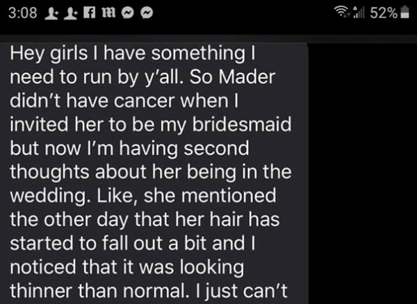humanity 0 Liked! 0 Disliked 0 Bridesmaid fighting cancer was told her ‘bald new look’ would ruin wedding by bridezilla by: Brady In: Douchebags, Humanity, Idiot, Shocking Jan 14, 2020 0 Liked! 0 Disliked 0 1 sarahbeth9090 Like this post? 0 Liked! 0 Disliked 0