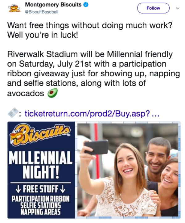 sports 0 Liked! 0 Disliked 0 Millennials outraged after baseball team advertises ‘Millennial Night’ with avocados, participation ribbons and napping stations by: Staff In: Genius or Stupid, I Do What I Want, Sports Jul 25, 2018 0 Liked! 0 Disliked 0 1 A promo for a Single-A minor league baseball game caused international attention after stoking the flames in the never ending war between Millennials and Boomers. Like this post? 0 Liked! 0 Disliked 0