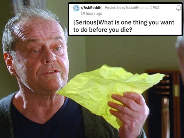 › Funny › GIFs , Ask Reddit Realistic “Bucket List” Items People Shared Ryder 1 hour ago Add Favorite 33 0 0 1 Bucket lists are always fun to bring up. They vary so much depending on the person. Don’t yuck someone’s yum. Let’s get into it!