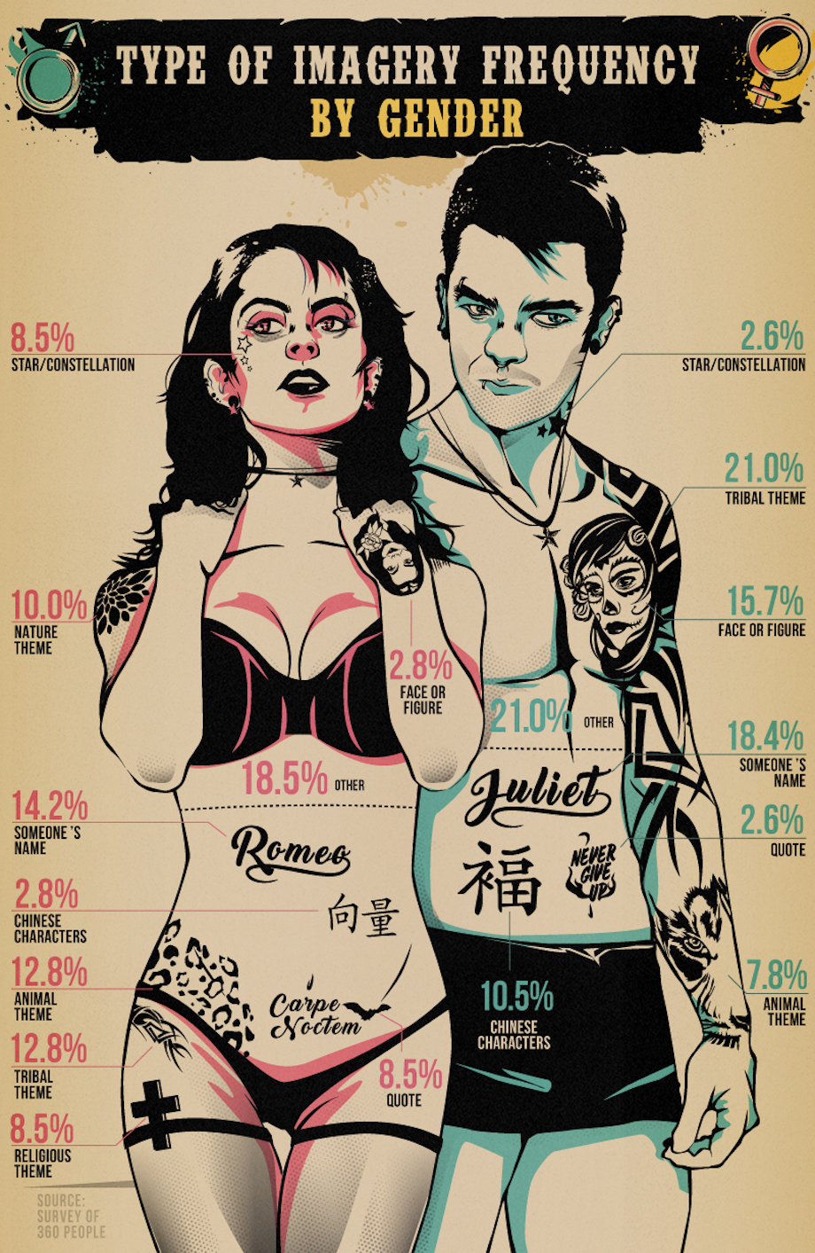 When it comes down to a battle between the sexes, there isn’t a lot of consensus regarding the placement of the ink, but they definitely had some opinions on the content/imagery of said ink. While other categories ranked higher for either gender, both agreed that Tribal Ink and other peoples names were what they regretted the most (21% of men and over 14% of women, respectively). Women also hated animal themes the second most (13%), while men really wished they hadn’t put a picture of someone’s face on their bodies (almost 16%).