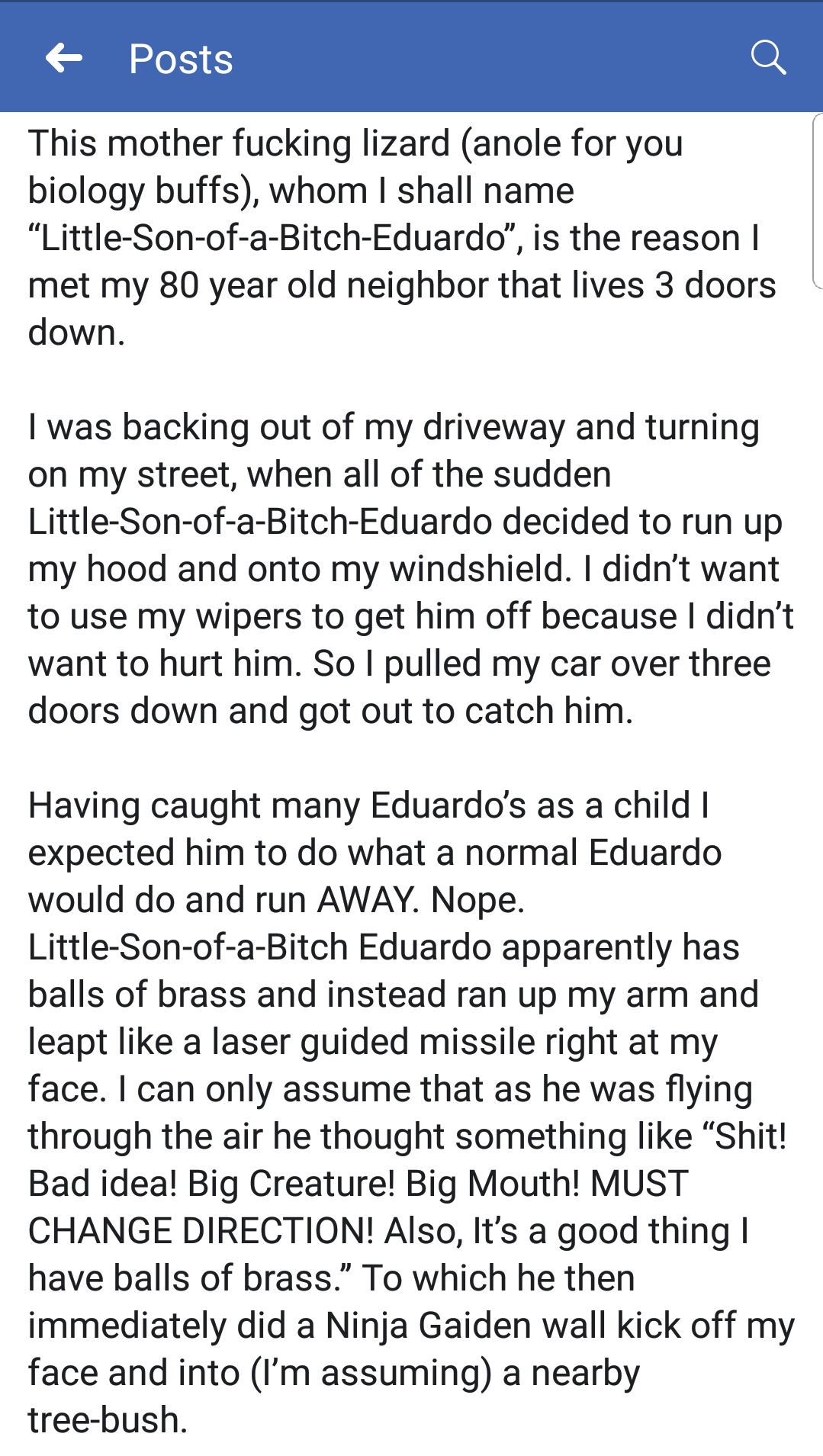 Whether he was guarding precious acorn treasure in his tree or had an unquenchable bloodlust for humans remains unknown, but if you got close enough to see his hateful little eyes, that predator missile of manslaughter would charge you. We all found out the hard way that nothing is more terrifying than a tiny animal who isn’t afraid of you. Just ask this guy who endured this attack from Little ‘Son-of-a-B*tch-Eduardo’ the lizard.