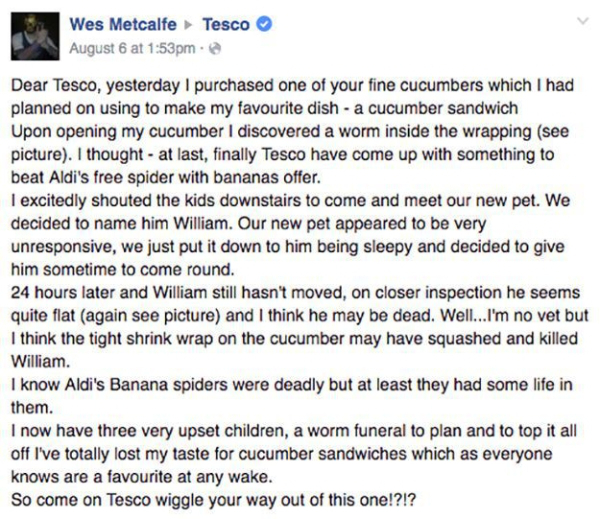humor 0 Liked! 0 Disliked 0 Man discovers dead worm in Tesco cucumber, holds funeral, and gives proper sendoff (13 Photos) by: Bob In: Animals, Beautiful, Humor Aug 9, 2016 0 Liked! 0 Disliked 0 1 IMAGE: FACEBOOK/WES METCALFE/TESCO Like this post? 0 Liked! 0 Disliked 0