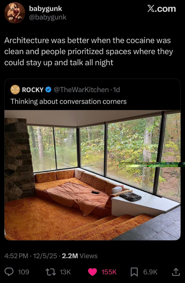 Conversation pits, conversation corners, playpens… whatever you call them (depending on which part of the world you’re in) we love them, and we think they should be immediately brought back.
