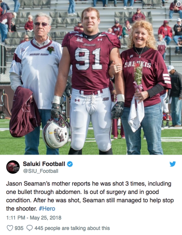 humanity 0 Liked! 0 Disliked 0 Former college football player takes three bullets tackling school shooter, protects students by: Staff In: Heroes, Humanity, Shocking May 25, 2018 0 Liked! 0 Disliked 0 1 When a student opened fire in his middle school classroom on Friday, a former college football linebacker tackled the gunman, despite being shot three times. His mother announced on Facebook that he was in “good condition.” Like this post? 0 Liked! 0 Disliked 0