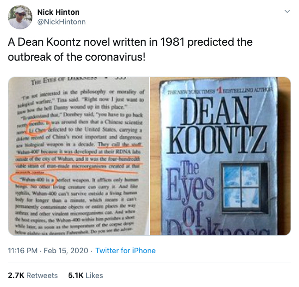 After a Twitter user posted this excerpt from Koontz’s The Eyes of Darkness, many people were shocked by the novel’s striking similarities to our current events, and it quickly went viral.