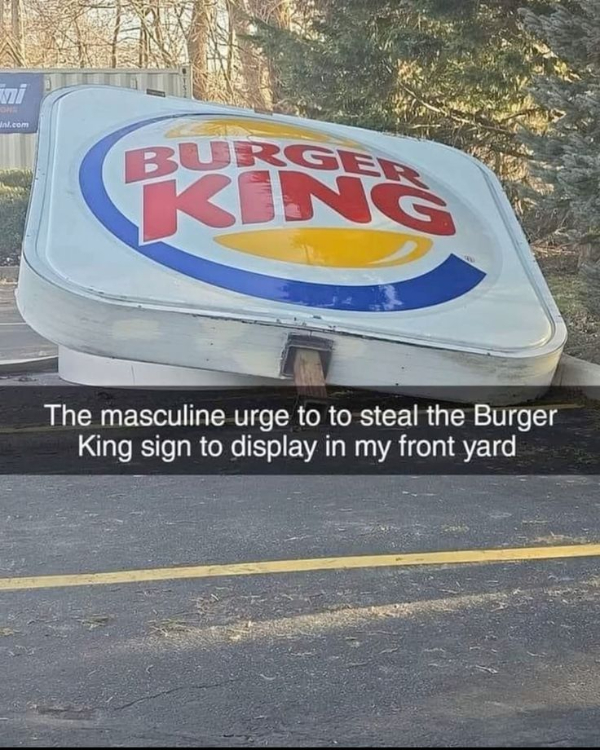 No one can explain the masculine urge to steal the Burger King sign to display in your front yard. When obviously there’s no BK there -.-