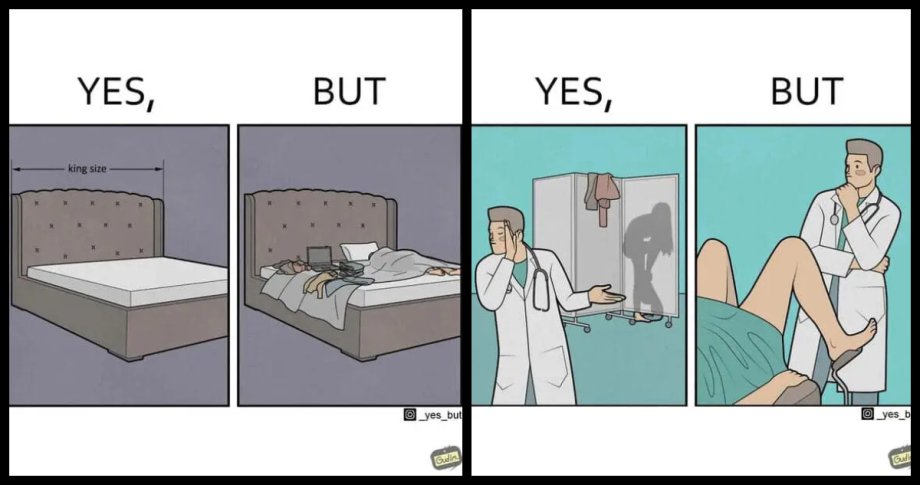 The entire formula is one panelling saying, “yes” and the other saying “but.” No backstory or explanation, just a simple visual punchline.