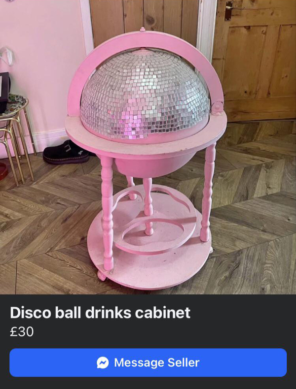 I keep finding objects online that make me want to buy a one-way ticket to a minimalist concrete bunker with no Wi-Fi, like this antique globe bar cart painted pepto-pink with a glittering disco ball earth that’s an insult to both geography and Saturday Night Fever. This is what happens when a history major and a party planner collide at a garage sale with a gallon of cheap acrylic paint and no supervision.