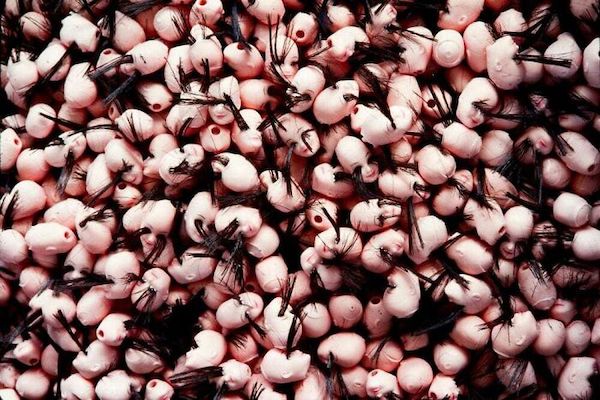 A bin of doll heads waiting to have their eyelashes trimmed.